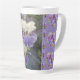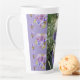 Lila Iris Iris blühende Latte Tasse. Ein prächtiges Blumendesign und ein Foto aus meinem Garten. Entworfen aus meinen ursprünglichen Aquarellbildern, die ich aus meinem eigenen Blumengarten gemalt habe.