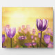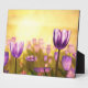 Eine goldene Sonne erhebt sich über ein Feld lila Tulpen.