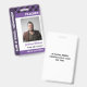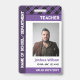 Vertikales Lehrer-ID-Abzeichen personalisiert mit Foto, Name, ID nr, Abteilung, und das Jahr, in dem das Abzeichen gültig ist in einem lila Design mit einem lila karierten Muster als kleines Detail.