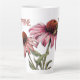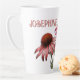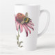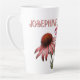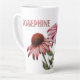 Personalisierte latte Tasse mit Naturdesign. Große Echinacea / Konflowers und Hummeldesign. Fügen Sie auf einer Seite einen Namen in Großbuchstaben hinzu. Eine wunderschöne botanische Illustration, die das Beste der Natur mit Heilkräutern und einem wohltuenden Bestäuber zeigt. Die Farben sind rot und rosa mit grün.