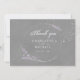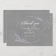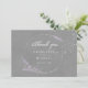 Vielen Dank Karte mit Aquarelllavender Blume, die in einem Kranz auf grauem Hintergrund angeordnet sind. Gratis Wasserfarben Spatter und Waschmaschine, extra Platz auf der Rückseite für eine persönliche Nachricht.