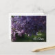 Verkünden Sie Ihre nächsten Nuptials mit den natürlichen Lila Lilac-Blume Hochzeit Save the Date Announcement Postcard. Diese hübsche, individuell geblümte Ehe behalte die Dattelkarte mit einem nahen Blumenfoto lila lila Blume-Blüten auf dem Baum mit einem Hauch von Morgensonnenlicht.