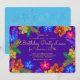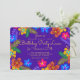 Lila Geburtstagsfeier zum Geburtstag. Die farbenfrohen, tropischen Hibiskus-Kunstwerke umgeben den hellgelben, dunkellila Text. Reverse ist hübsch tropisch blau und hat auch einen Blumendruck.