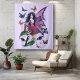 Niedliche, schwarzhaarige Feen, lila und rot, die auf einem Pilz sitzen, in einer lila Umgebung