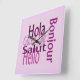 Sag Hallo in fünf Sprachen mit einer lila Wanduhr. Diese Uhr fügt Ihrer Wand eine schöne Farbe hinzu, sie ist perfekt für Mädchen Zimmer Dekoration.