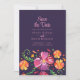 Eleganz mit einer Touch von Lebendigkeit durch unsere "Lila mexikanische lebendige florale Fiesta Save the Date Einladung" vor einem dunklen lila Hintergrund. Die untere Hälfte blüht mit handbemalten Aquarellfarben in Orange-, Rot- und lila-Tönen, die Energie und Feiern ausstrahlen. Der obere Teil präsentiert Ihre wichtigen Save the Date Details in einem raffinierten, sanften rosa Text und schafft einen fesselnden Kontrast zur dunklen Leinwand. Dieses Design strahlt Raffinesse und Festlichkeit aus und bietet eine kühne und stilvolle Möglichkeit, Ihren bevorstehenden besondere Anlass zu verkünden.