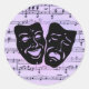 Künstlerisches Talent kommt in vielen Formen und wenn sie sich vereinen, ist es spektakulär. Die griechischen Theatermasken von Komödie und Tragödie liegen auf einem Notenblatt.