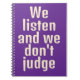 Funny Quote Notizbuch . Wir hören zu und beurteilen nicht.