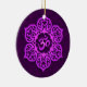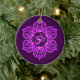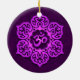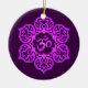 Ein Om oder ein OM entwerfen sitzt nach innen von einer stylised Lotos-Blume. Das Kreismuster wird mit einem tiefvioletten gefärbt, das hervorgehoben wird, um einen hellen Glanz auf der Oberfläche zu schaffen. Der Hintergrund ist gemaltes dunkles Lila, das durch den negativen Raum der Blume gesehen werden können. Ein Schatten erscheint gerade unter dem Entwurf, der ihn macht, scheinen, gerade über die Oberfläche der Verzierung zu schwimmen. Dieser stilvolle Entwurf ist eine auffallende Darstellung dieses geistigen Symbols.
