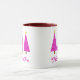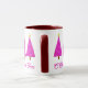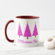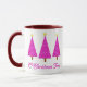 Tasse in einem modernen Nehmen an einem klassischen Weihnachtsbaummotiv - drei Orchideen- und Lavendelbäume, mit weißem Akzent, auf Magenta mit tiefem amethystischem lila Hintergrund, mit dem Text "O Christmas