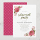 Diese Party Einladung der Aquarellblume bietet lila und pfirsichfarbene Blume, grüne Blätter, die Wörter "Pensionskarte Party" in trendigem, grünem Pinselskript und -karte mit einem lila Muster. Es ist eine ideale Einladung für ein Party im Frühling oder im Sommer. Karo passende Artikel wie Aufkleber und Porto-Briefmarke hier https://www.zazzle.com/collections/119859477642512460?rf=238364477188679314 Personalisieren Sie sie mit Ihren Daten, indem Sie den Platzhalter-Text ersetzen. Für weitere Optionen, wie zum Beispiel den Schriftart, die Textgröße/Schriftfarbe, den Abstand zwischen den Buchstaben zu ändern oder um den gebogenen Text zu kontrahieren oder zu erweitern, klicken Sie auf die Schaltfläche "Anpassen". *Bitte beachten Sie, dass das Zazzle-Wasserzeichen, das in der Zoomvorschau angezeigt wird, NICHT auf dem gedruckten Endprodukt erscheint. © Rosewood and Citrus