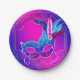 Rosa und lila Maskerade Party Papier Teller mit schönen aquamarin blauen und lila Federmaske auf einem schönen lila und rosa Hintergrund. Sie können Text hinzufügen, um diese wunderschönen lila und aquamarinen blauen Maskerade Party Papier Teller personalisieren.