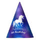 Lila Imitat-Folieunicorn-Silhouette-Mädchen-Geburtstags-Papier-Party-Hüte. Hübsche weiße Silhouette eines Unicorn auf Imitat vereiteln lila und blauen Hintergrund. Personalisiert mit Geburtstagsmädchennamen im weißen Schriftart und in ihrem Alter. Spaß Unicorn-Partyversorgungen für einen themed Geburtstag des Unicorn. www.SamAnnDesigns.com