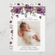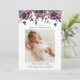 Rustikale Geburtsankündigungskarte mit einem senkrechten Foto Ihres Neugeborenen mit Aquarellbildern für lila Peonie mit Grün.