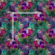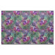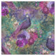 Dieses kühne Design zeigt einen lila Pfau mit einer Goldkrone, umgeben von rosa und violetten Blumen auf einem Hintergrund lila, aquamariner und blauer Elemente mit goldenen Blumenelementen.