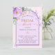 Ein pfirsichfarbener Hintergrund mit einem lila, violetten Bogen. Die Einrichtung besteht aus lila Blüte, Blume der Rose, grünem Eukalyptusgrün und Schmetterlingen. Personalisieren und fügen Sie den Namen der Braut zu sein und Party Details.