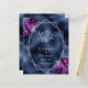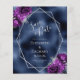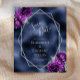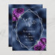 Diese elegante, moderne Hochzeit bewahrt die Dattelkarte mit einem silbernen geometrischen Rahmen, der mit lila Pflaumenbouquets und silberfarbenen Blumensträußen auf einem seeblauen Imitat-Hintergrund dekoriert ist. Der anpassbare Text kombiniert silbergraue, weißliche Handschrift, Kupferplatte und kursiven Schriftart. Die Rückseite wiederholt das navy-blaue Folienbild.