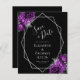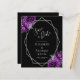 Diese elegante moderne Hochzeit bewahrt die Dattelkarte mit einem silbernen geometrischen Rahmen, der mit Pflaume und silberfarbenen Blumenbouquets auf schwarzem Hintergrund dekoriert ist. Der anpassbare Text kombiniert silbergraue, weißliche Handschrift, Kupferplatte und kursiven Schriftart. Die Rückseite ist schwarz.