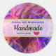 Personalisiertes "handgefertigt mit Liebe" Aufkleber-Set auf einem kreativ und cool aussehenden modernen abstrakten Fraktal Design mit scharfen Scheiben und spitzen spitzen Kanten, die ihm ein glänzendes modernes Aussehen verleihen. Lila Rosa- und Rottönen mit Farbtupfern sorgen für ein lebendiges und spannendes Ambiente. Ein transparentes Banner mit einer goldenen Grenze erstreckt sich über das Zentrum, wo Sie mit Ihrem Unternehmen oder Namen personalisieren können.