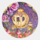 Prinzessinnen-Aufkleber mit hübscher Goldkutsche auf einem wunderschönen lila und goldenen blumigen Hintergrund.