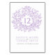 Circling Blatt Design monogramm Hochzeit Tischnummern. Fügen Sie Ihre eigenen Tischnummern mit einem, Name und Hochzeitstermin in lila auf einem weißen Hintergrund. Andere Farben und passende Hochzeitsartikel sind erhältlich. © Original Blatt zeichn und Design von Sarah Trett für www.mylittleedenweddings.com auf zazzle.