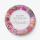 Lila und rosa Aquarellfarben-Wildblumen "Zum Geburtstag glücklich" Papier Teller. Text, Schriftart, Schriftart und Farbe sind vollständig anpassbar, sodass diese Teller Ihre eigenen sind. Schauen Sie sich unsere passenden Party-Vorräte an.
