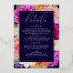 Atemberaubendes Blumendesign mit Rose, Bauern, Kosmos, Dahlien und Iris-Blume. Dunkelblauer Hintergrund. Rose Golddruck mit Blumentypografie für die Namen von Braut und Groom. Elegante Schrift. Details auf der Rückseite. Lila, rosa, weiß, gelb, rot, rosa, grün. Fett, gesättigte Farben. Festiges und modernes Hochzeitsdesign in Aquarellfarben.