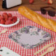 Diese Osterpapiertafel hat eine rosa und lila Federkränze an der Kante auf einem Lavendelhintergrund. Koordiniert mit Produkten aus der Sammlung Osterflorkreuz.