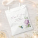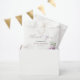 Es ist ein einfaches und schönes Bild mit einer lila Aquarell-Rose, Blätter und einem lebendigen Kolibris mit weißem Hintergrund mit einer weichen lila Grenze.