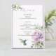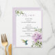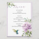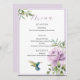 Es ist ein einfaches und schönes Bild mit einer lila Aquarell-Rose, Blätter und einem lebendigen Kolibris mit weißem Hintergrund mit einer weichen lila Grenze.