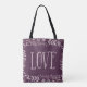 Lila ganz vorbei - drucken Sie die Taschentasche, die schönes rustikales Blumen mit dem Wort "Liebe" kennzeichnet. Groß als Tasche für Ihr Einkaufen und reizend als Geschenk besonders für Valentinstag.