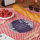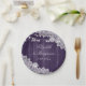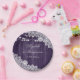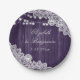 Elegante und romantische rustikale lila Hochzeitsfeier Teller inspiriert von Stallholz, weiße Blumenspitze und Lichter.