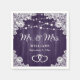 Dekorieren Sie Ihre lila rustikale Hochzeitsfeier mit diesen romantischen Servietten aus Hochzeitszettel, in denen sich die Herzen verwoben fühlen, mit einem rustikalen Holzfußboden, der mit eleganten, blumigen Spitzen und Lichtern an der Saite geschmückt ist.