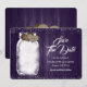 Rustikale lila Hochzeiten sichern die Dattelkarte mit einem Maurerkrug mit Saitenlampen und mit zwei Berglingsherzen auf einem Holzhintergrund. Einfach personalisieren Sie diese romantische rustikale lila Hochzeit speichern Sie das Datum online. Matching Artikel zur Ergänzung dieser lila Hochzeit speichern Sie das Datum.