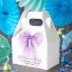 Elegante Geschenkboxen für die Hochzeitsdusche mit lila Koketten-Schleifen-Wasserfarbe, "mit Liebe und Dank" in moderner Schriftart und dem Namen der Braut und dem Datum der Dusche in einfacher Schrift.