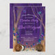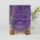 Bezauberter lila Wald, goldene Glitzern, die aus Torarollen hervorgehen und wunderschöne lila, rosa und blaue Schmetterlinge freisetzen. Whimsical Storybook Style Fledermaus Mitzvah Einladung ist blendend mit einem miessigen lila Wald beleuchtet durch das Glühen eines Schmetterlingswirbels.