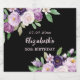 Ein schwarzer Hintergrund. Personalisieren und fügen Sie Datum, Namen und Alter hinzu. Der Text: Der Name wird mit einem modernen handgeschriebenen Stilskript geschrieben. Die Rose sind mit wasserfarbenen Blume in Rosa, Lavendel und lila.