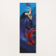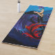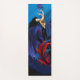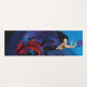 Schwarz-Haar-Meerjungfrau mit einem schwarzen, roten und blauen Schwanz tanzt im Meer mit zwei lila Wasserdrachen. Um sie herum bläst Wasser.