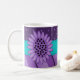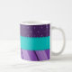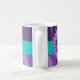 Moderne Kaffee-Tasse mit einer lila Blume, Türkisösenband auf einem lila Polkapunkt und Streifenhintergrund. Fertigen Sie ihn besonders an, indem Sie Text addieren, wenn Sie wünschen.