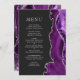 Das elegante, moderne Hochzeitsmenü mit lila Aquarellrahmen und Imitaten mit silberfarbenem Glitzer liegt am rechten Rand. Der anpassbare Text kombiniert silbergraue römische Serifen- und Copperplate-Schriftart auf schwarzem Hintergrund. Auf der Rückseite ist ein lila und silberfarbenes Design erkennbar.