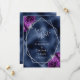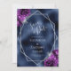 Diese elegante, moderne Hochzeit bewahrt die Dattelkarte mit einem silbernen geometrischen Rahmen, der mit lila Pflaumenbouquets und silberfarbenen Blumensträußen auf einem seeblauen Imitat-Hintergrund dekoriert ist. Der anpassbare Text kombiniert silbergraue, weißliche Handschrift, Kupferplatte und kursiven Schriftart. Die Rückseite wiederholt das blaue Folienbild.