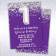 Lila und silberne 1. Geburtstagsfeier Party Einladung 1 Geburtstagsfeiereinladung mit Glitzer und modernem Drehbuch und lustigen Ballons.