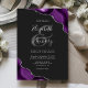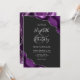 Ein lila Aquarelldesign bestickt mit Imitaten silberner Glitzer erscheint in zwei Ecken dieses eleganten Designs. Personalisieren Sie es mit den Namen des Paares in silbergrauem Schriftzeichen über einem großen grauen Ampersand. Fügen Sie die Hochzeitsdetails in Copperplate und kursiven Schriftart auf einem schwarzen Schieferboden hinzu. Auf der Rückseite ist ein lila und silberfarbenes Design erkennbar.