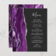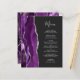 Die links Seite dieses eleganten, modernen Hochzeitsmenüs besticht durch eine lila Aquarellgrenze, die mit Imitaten aus silberem Glitzer besticht. Der anpassbare Text kombiniert silbergraue Handschrift-Skripte und Copperplate-Schriftart auf einem schwarzen Hintergrund. Auf der Rückseite ist ein lila und silberfarbenes Design erkennbar.