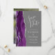 Der links Rand dieser eleganten modernen Hochzeit bewahrt die Dattelkarte mit einem lila Aquarellrahmen, der mit silberfarbenem Imitat-Glitzer bestickt ist. Der anpassbare Text kombiniert silbergraue Handschrift, Kupferplatte und kursiv Schriftart auf einem mittelgrauen Hintergrund. Ersetzen Sie das Beispielbild auf der Rückseite einfach durch Ihr eigenes vertikales Foto.