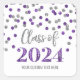 Individuelle Name-Klasse von 2024 Abschluss Aufkleber mit silber und lila Konfetti-Muster mit modernem Schreibstil.