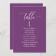 Helfen Sie Ihren Gästen mit diesen eleganten, modernen Sitzplakaten mit Gästebamen ihren Tisch zu finden. Doppelseitige Karten, damit die Gäste von beiden Seiten, vorn oder hinten nach ihren Namen suchen können. Klare Platzverhältnisse, die Ihnen die Möglichkeit geben, Clips oder Lochausschnitte für hängende Displays zu verwenden oder Tischhalter/Rahmen zu verwenden. Lila Hintergrund und weißer Text. Moderne handgeschriebene Kalligrafiedetails. Mehrere Farboptionen. Haben Sie alle Tischnummern in der gleichen Farbe oder mischen Sie die Farben nach dem Farbthema Ihres Events.