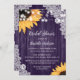 Feiern Sie die Braut mit dieser eleganten, rustikalen, lila Blumendusche, die mit Sonnenblumen auf einem Holzboden mit weißem Blumengeflecht und Lichtern an der Saite geschmückt ist.