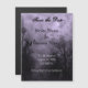 Eine bearbeitbare Date-Magnet-Vorlage mit schwarzen Grunge-Skriptbuchstaben, Blakkletter für die Braut- und Bräutigam-Namen und mehr Platz für Ihre persönlichen Informationen in hellgrau, mit Kunst eines Spuk Himmels mit bewölktem Vollmond, spoky Bäume und Raben mit lila Farbe.