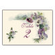 Teil eines passenden Set von Hochzeitskunst, einer Tischnummer-Karte mit einem Vintagen Aquarellbild von mauvischen und lila Pansy-Blume, von der Künstlerin Marie Low aus dem 19. Jahrhundert. Die Karte ist mit einer formalen Schriftzeichen in Farben ausgelegt, um der Abbildung zu entsprechen, sodass eine altmodische elegante Oberfläche entsteht.